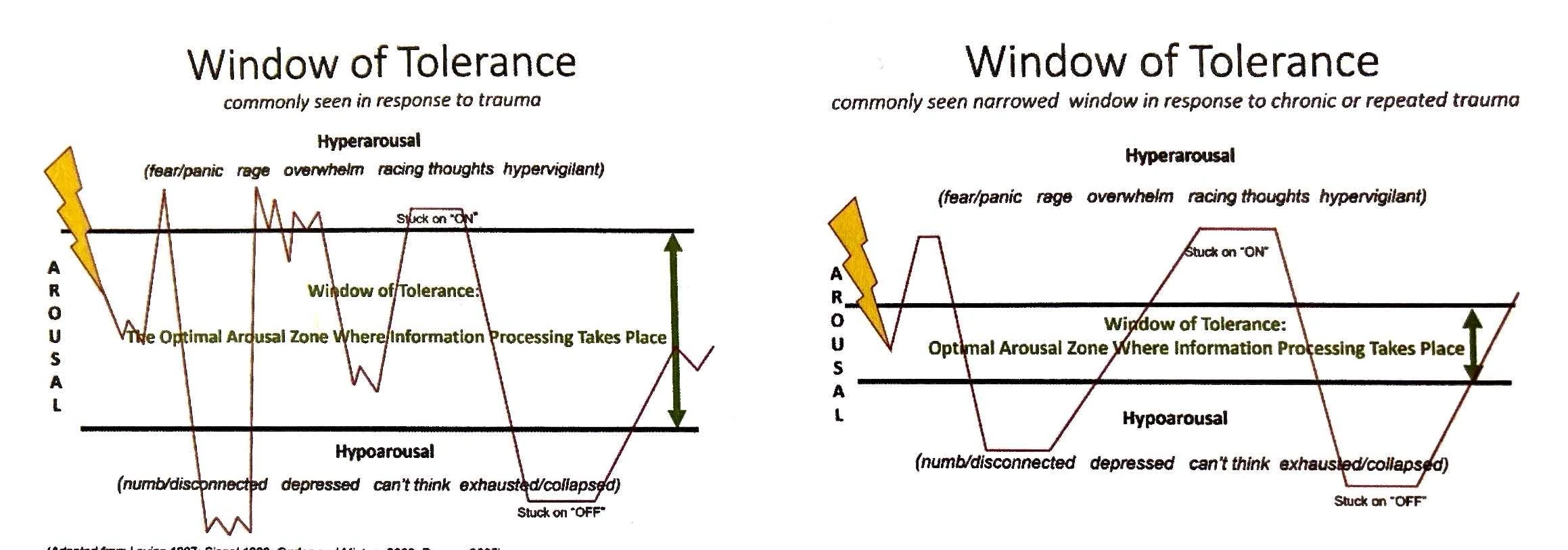 An essential step in personal change and readiness to process underlying trauma is to increase our ability to manage distress. First, we must have the capacity to navigate distress, in EMDR we call these “resources”. Our resources guide and increase our ability to manage, activate, and heal from distress and trauma. An important phase to remember as you begin therapy is the concept window of tolerance. Dr. Dan Siegal, MD, a clinical psychologist who has written numerous books on attachment and interpersonal neurobiology coined this phrase to describe the impact of trauma on our nervous systems. We all have a window, either narrow or wide, with which we are able to manage various types of distress.